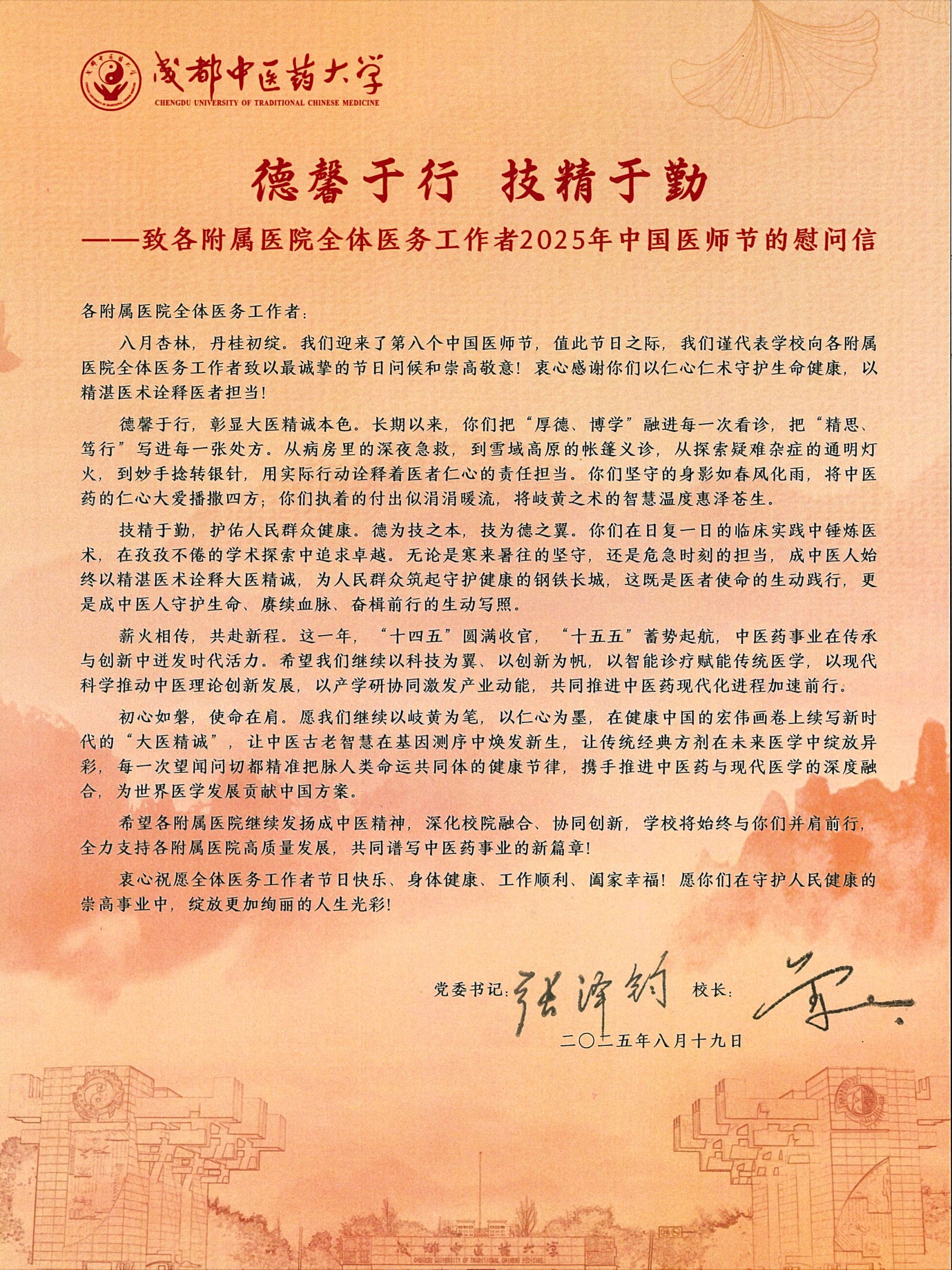 致全体医务工作者2025年中国医师节的慰问信 发布时间:2025-08-18 10:40:57 浏览次数: 次 【字体:小 大】 【打印正文】 上一条:喜讯!Beat365官网首次上榜世界大学学术排名(ARWU)榜单 下一条:天府永安湖实验室组建方案通过专家论证
