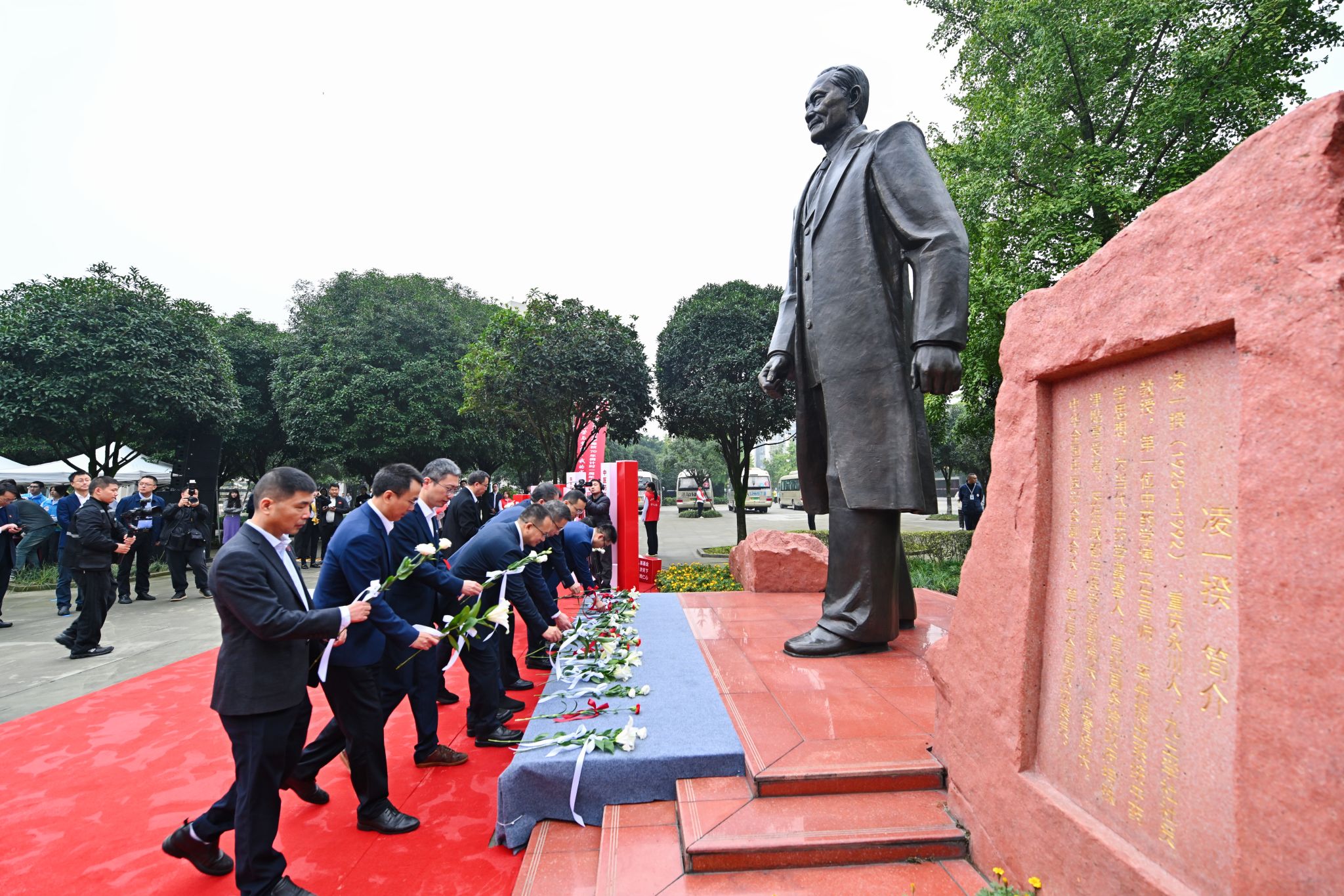 20世纪30年代,李斯炽先生以远见卓识拓荒中医教育,在“废止中医”的逆流中筑起四川中医药薪火相传的阶梯。观礼嘉宾驻步李斯炽先生雕像前广场,敬仰李斯炽先生如松风骨、若海襟怀、仁爱之志。到会嘉宾依次向李斯炽先生雕像敬献鲜花。