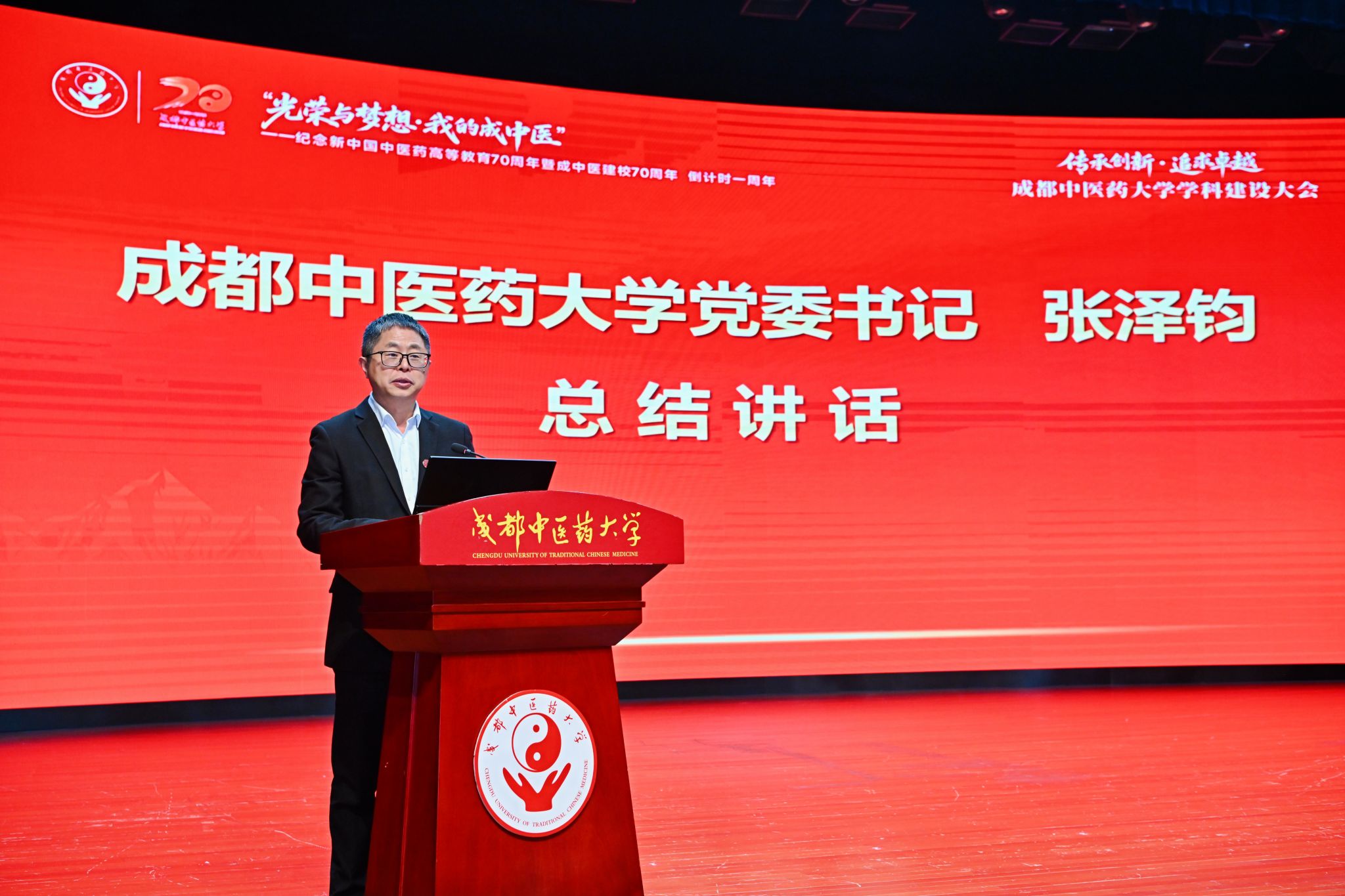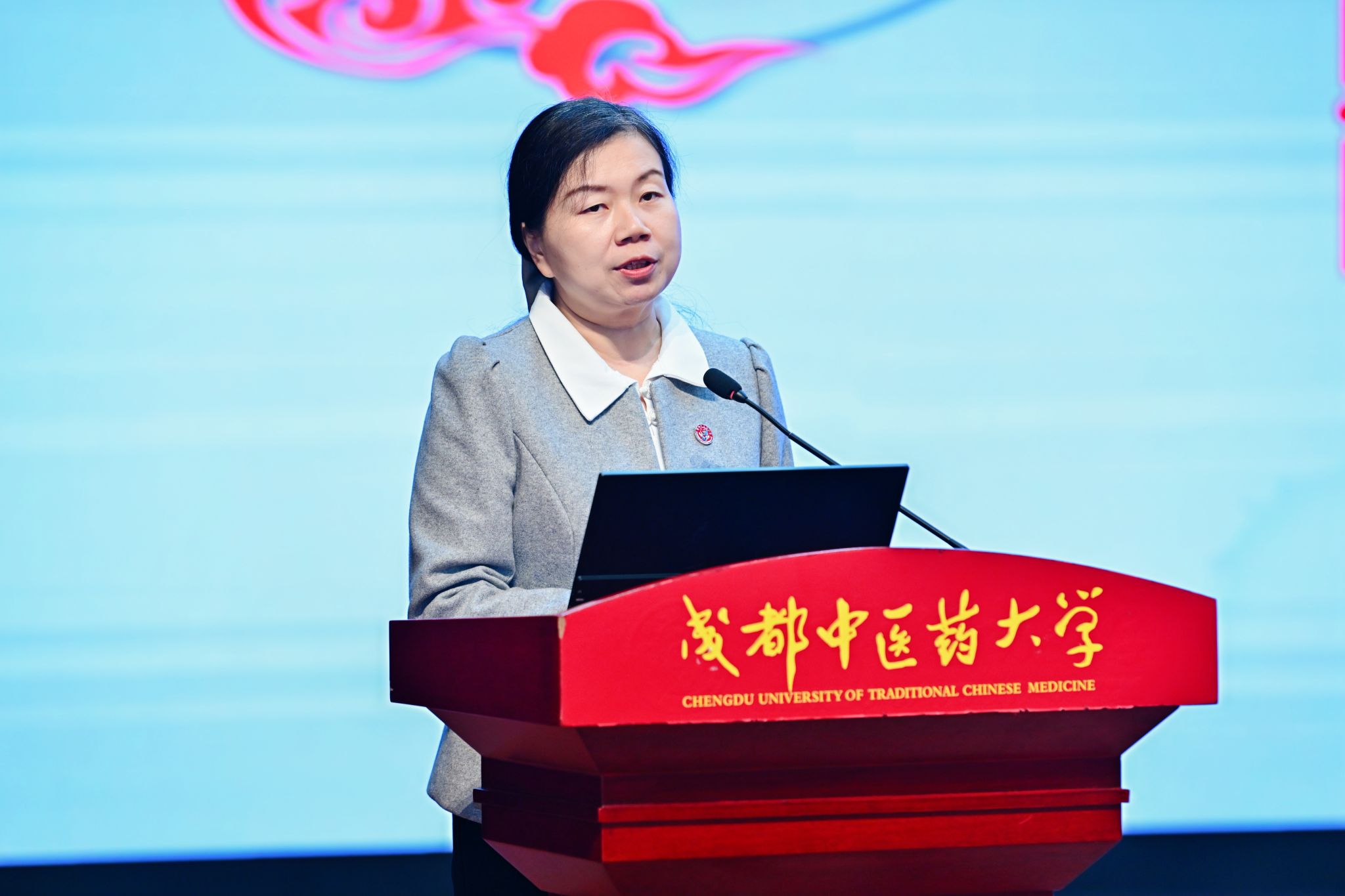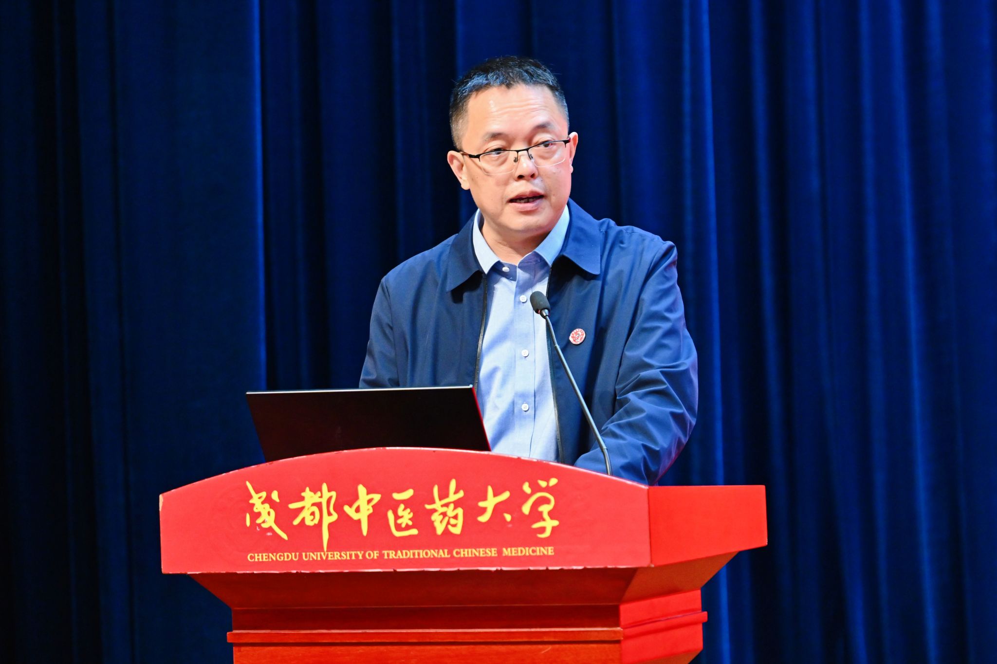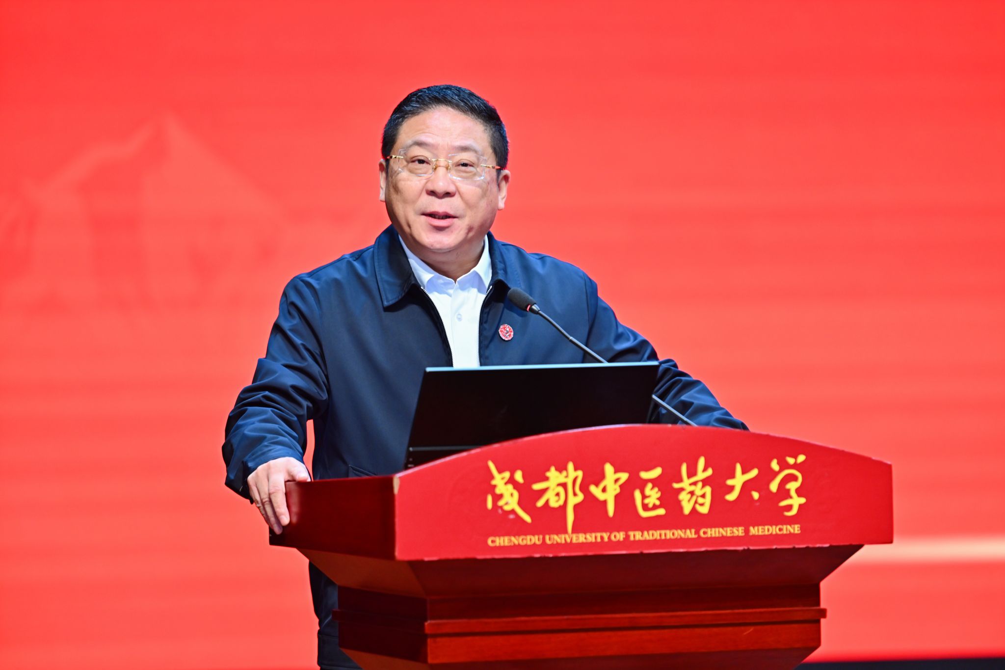 廖飞讲话,代表四川省教育厅对学校即将迎来建校70周年致以热烈祝贺,对学校“双一流”建设取得的成就表示由衷赞许。他指出,“十五五”期间,学校应紧扣人才自主培养固本基石,造就新时代中医药拔尖创新人才;紧扣科技自主创新战略重点,提升科技成果转移转化效能;紧扣教育对外开放关键环节,加快中医药扬帆出海新征程。他鼓励学校以一流学科建设为龙头引领,加快形成具有成中医特色的高水平学科体系,为教育强省和治蜀兴川贡献成中医力量。