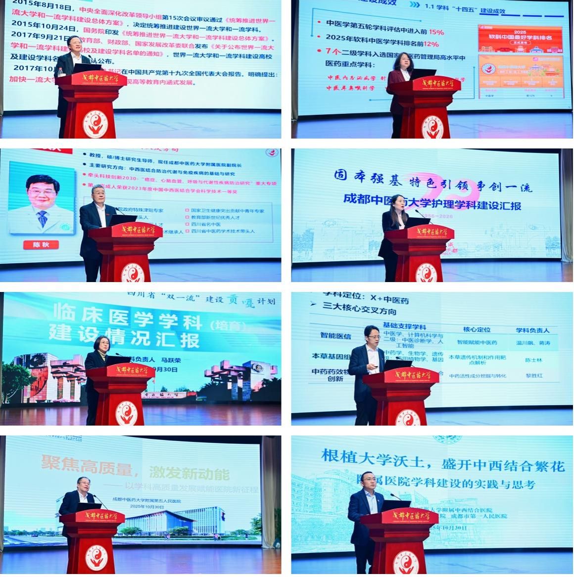 随后,国家一流建设学科中药学学科带头人彭成教授,四川省一流建设学科中医学学科代表蔡定均教授、中西医结合学科带头人陈秋教授、护理学学科带头人高静教授、临床医学学科代表罗晓红教授,新兴学科中医药交叉学科代表张三印教授,以及成都市第五人民医院党委书记周政、成都市中西医结合医院院长李超,分别围绕“十四五”学科建设成效、不足以及“十五五”学科建设思路和目标等进行了交流汇报。