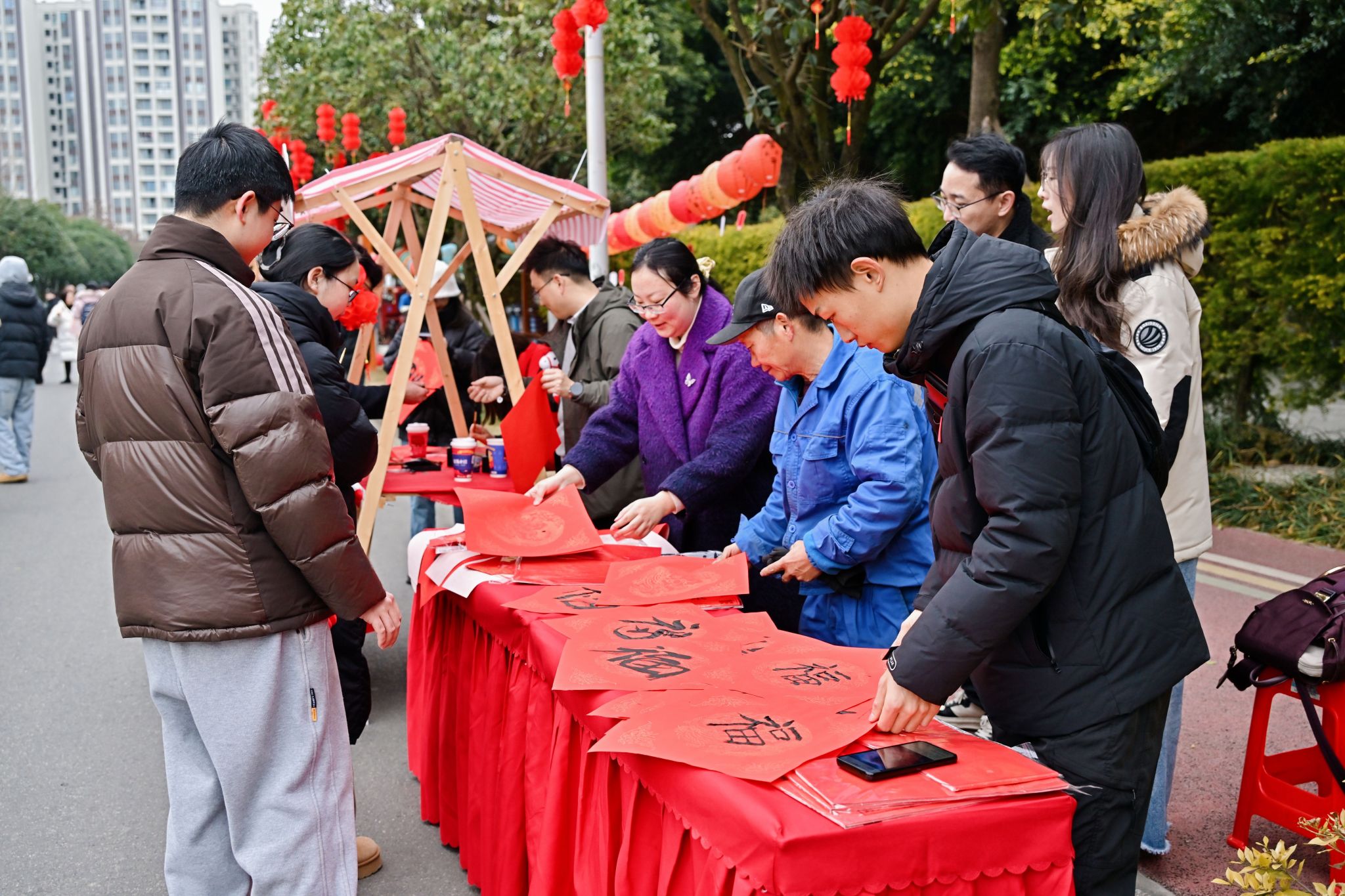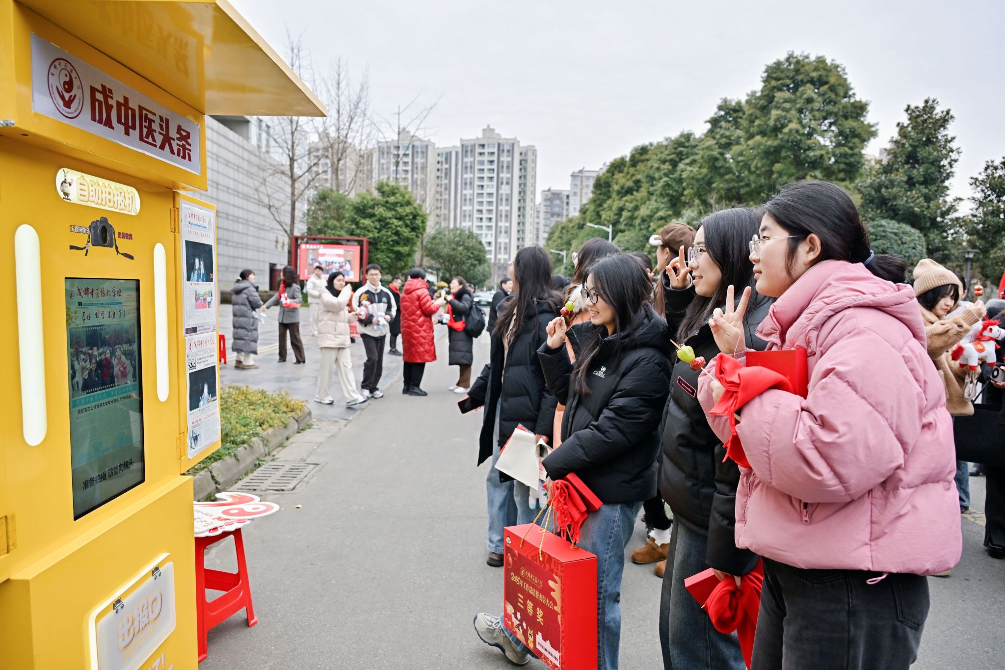 马蹄声声催奋进,喜乐融融迎新春。会后,百会堂外广场聚集了众多前来参加游园活动的师生,红彤彤的灯笼高高挂起,甜蜜蜜的糖画勾勒笑脸。猜灯谜、写福字、比投壶,制作一份专属自己的校报头条,拍下带有成中医祝福的快乐瞬间,热闹的游园活动为辛劳一年的成中医人带来温暖和关爱。