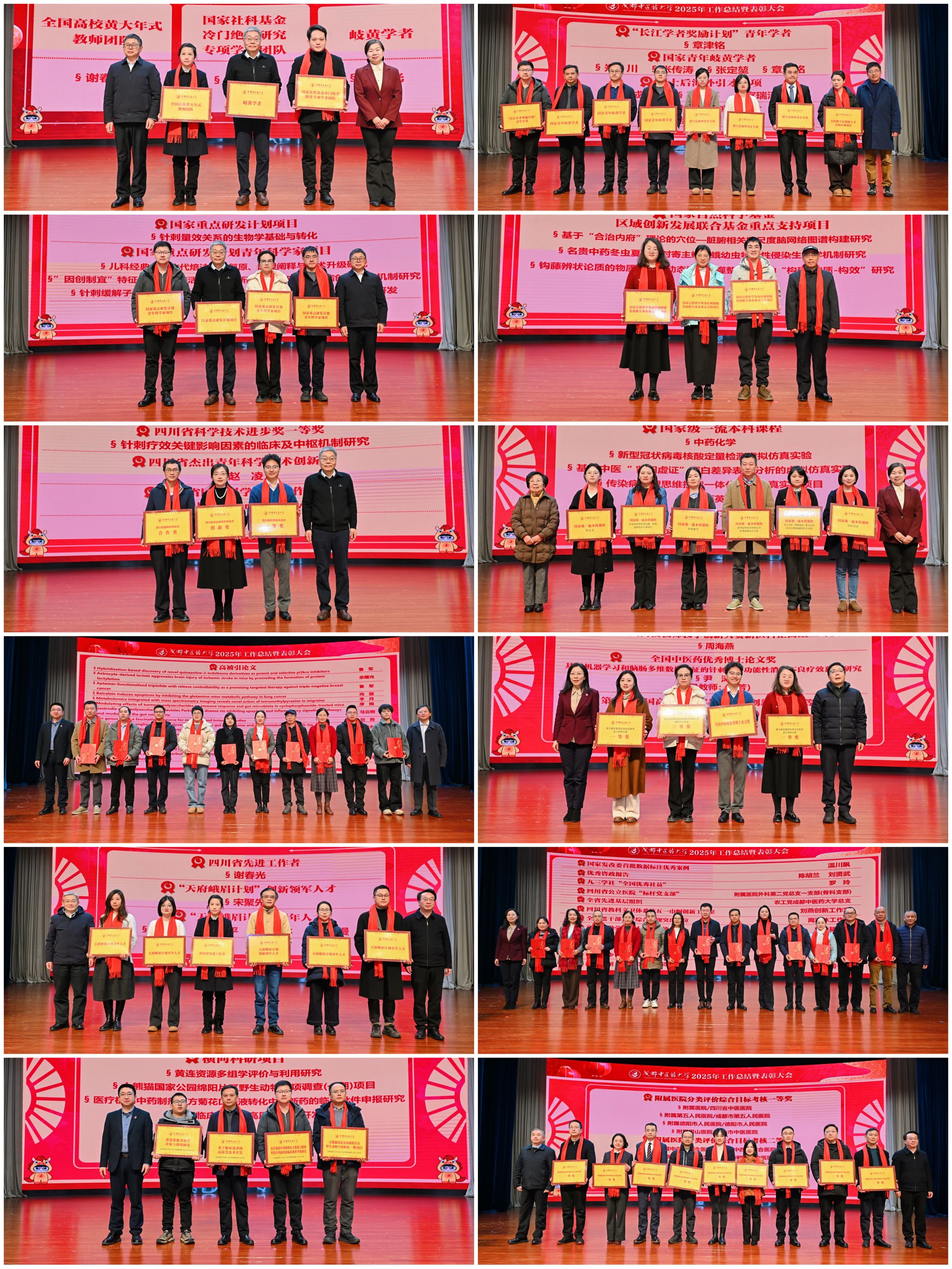 每一滴汗水都当被看见,每一份付出都值得肯定。大会隆重举行表彰仪式,进行了23轮颁奖,涵盖获国家级、省部级重要认定、奖励等单位和个人;获国家级一流课程、高水平论文成果、省部级人才称号、高水平竞赛优秀名次的师生;在党建统战、学工思政、安全稳定、后勤保障、信息化建设、参政议政等方面代表学校获得优秀成绩的集体和个人;以及各临床医学院/附属医院分类评价综合目标考核、学校职能部门/学院目标管理考核、中层干部考核优秀人次和代表等。一轮轮的颁奖,是对过去一年成中医人奋勇争先、勇创佳绩的最好褒奖,也是未来征途上跃马扬鞭、笃行奋进的巨大动力。