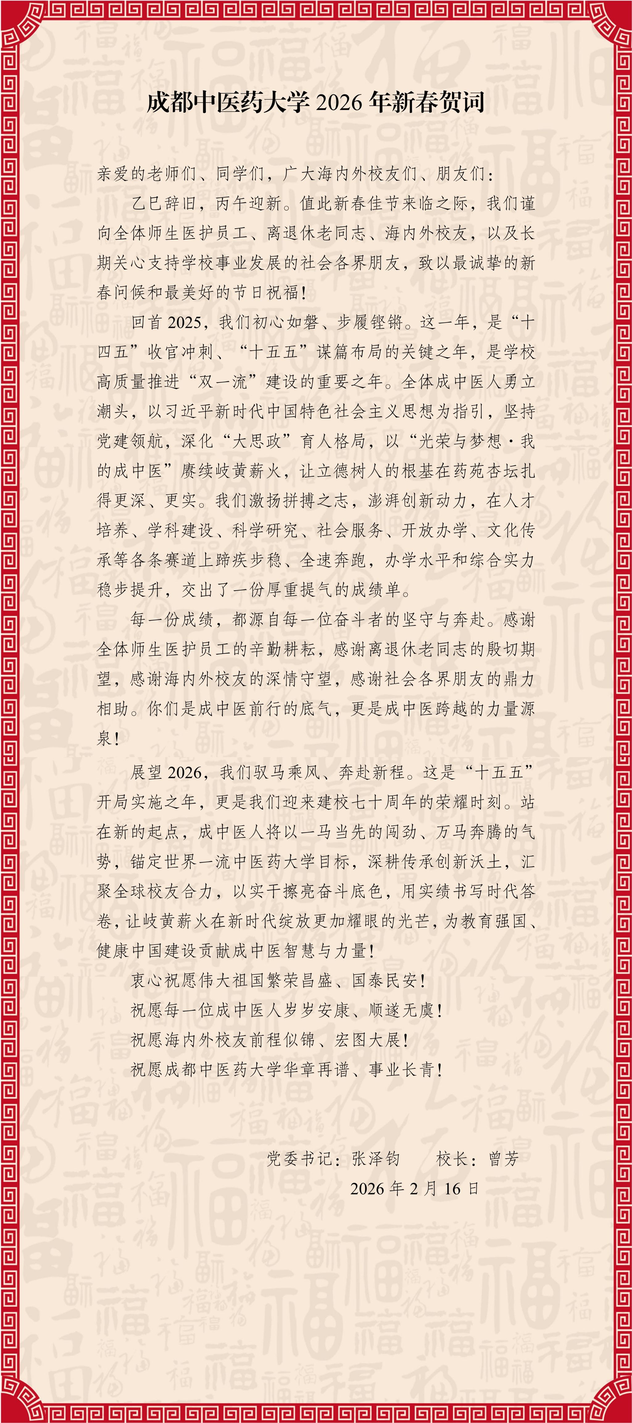 Beat365中文官方网站 2026 年新春贺词 发布时间:2026-02-16 00:00:02 浏览次数: 次 【字体:小 大】 【打印正文】 上一条:一马当先 奋力推进学校事业更高质量发展 下一条:Beat365中文官方网站党委常委班子召开2025年度民主生活会