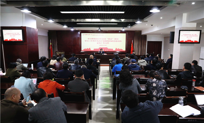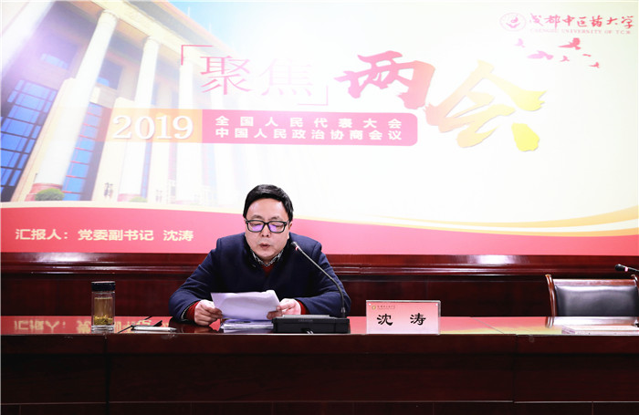 会议首先由党委副书记沈涛传达2019年全国两会精神。他介绍了今年两会基本情况,对李克强总理作的《政府工作报告》、习近平总书记在两会期间发表的重要论述进行了详细说明,并就其中与教育、学校工作相关的内容进行了深入阐释,要求全校师生切实将两会精神融入到自身工作中,坚定发展信心,激发实干力量,为学校“双一流”建设贡献力量。