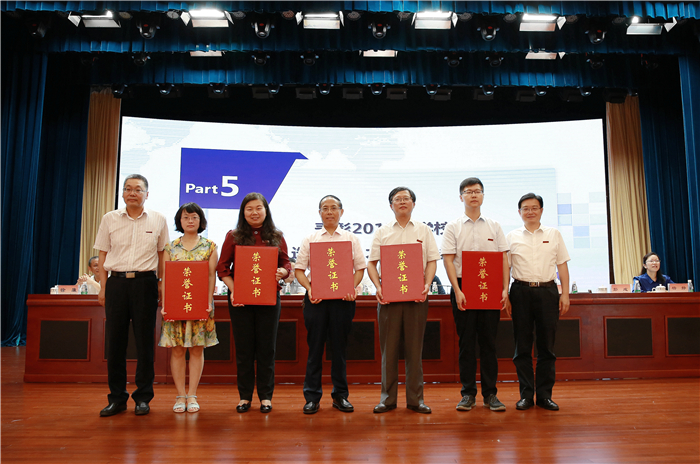 会议表彰2017年学校入选国家人才项目优秀人才。学校党委副书记沈涛宣读表彰决定;刘毅、余曙光为学校曾芳教授、梁繁荣教授、国家优秀青年科学基金项目获得者赵凌教授和章津铭等5位代表颁发奖金和证书。