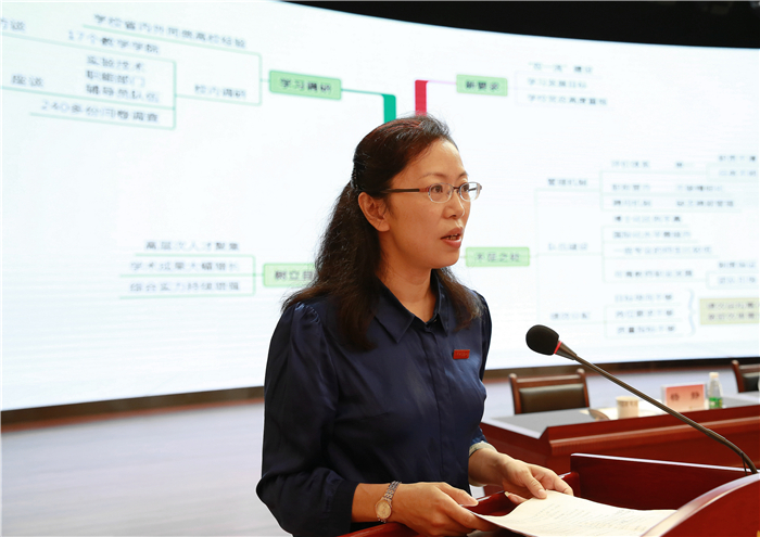 在大会的第二阶段,杨静作题为“学校人才强校制度建设的逻辑”的人事制度改革方案及其制度制订的说明。她说,制度安排是大学治理的核心,以绩效管理为核心的人事制度改革及人才制度建构,保障学校“双一流”建设,是学校人才强校制度建设的逻辑。她用“车头带”“车身快”“道路宽”“动力足”四个比喻,详细解读了提交大会的5个类别16个文件和制度的结构、内容及特点,指出要加快推进杏林学者内培外引再突破,大力推进杏林青苗成长的培育支持,全面推进全员分类发展与评价的改革优化,深入实施岗位绩效分类与考核的激励政策。杨静从突出岗位管理、实施分类评价、采用量化考核、引入质量评价四个方面解读了绩效改革文件精神。她说,任何改革都是时代与发展的倒逼,都是对既往陈规的突破,对习惯思维的扭转,“胜利不会向我们走来,我们必须自己走向胜利。”在学校党委的坚强领导下,全校齐心协力,人才强校战略就一定能实现,“双一流”目标就一定能实现。