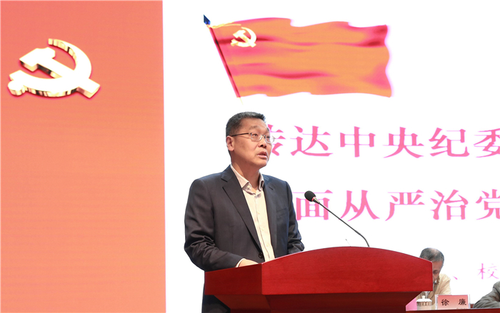 陈飞充分肯定学校全面从严治党取得的成绩。他说,这次会议的召开彰显了学校党委立足新时代推进全面从严治党向纵深发展的坚定决心和意志。陈飞深入分析当前全国、全省和高校系统全面从严治党面临的形势,就做好学校的全面从严治党工作提三点意见。第一,从严治党,从严治校,人人担责。“党政军民学、东西南北中,党是领导一切的。”要坚持党对高校的全面领导。从严治校,必先从严治党。党委履行主体责任,纪委履行监督责任,党委书记履行第一责任人责任,班子成员履行“一岗双责”,全校各级党组织层层履行责任、人人担负责任,切实把全面从严治党各项工作引向深入。第二,察形见势,提高警惕,防患未然。陈飞用翔实的数据,深入分析当前全省高校全面从严治党的薄弱环节,希望学校推进管党治党向纵深发展,着力营造风清气正的良好政治生态和育人环境。第三,明确任务,突出重点,狠抓落实。省纪委监委将开展大清理、大督查、大调研、大宣讲、大培训五大专项行动,助推高校党风廉政建设和反腐败工作破题起势。