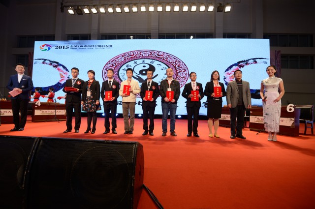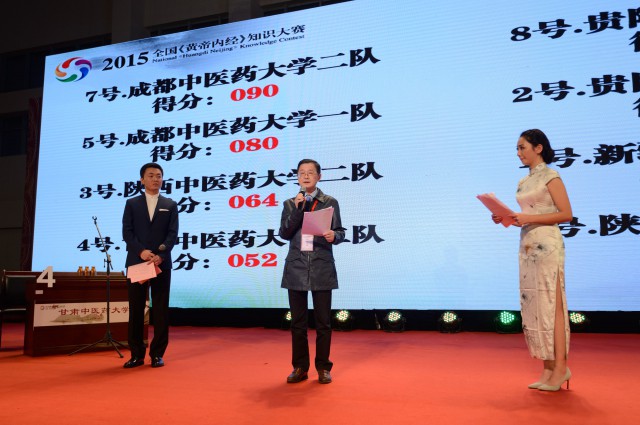 10月31日晚,2015全国《黄帝内经》知识大赛西南西北区域复赛第二轮比赛在温江校区体育馆举行。学校党委副书记、副校长沈涛,复赛仲裁专家组组长张新渝,教育部高等学校中医学教学指导委员会代表李增艳出席。复赛仲裁专家组、各代表队师生与Beat365官网数千名师生共同观看了比赛。参加复赛的14支代表队通过上午第一轮笔试、现场答题两个环节的激烈角逐,总分排名前八的代表队晋级第二轮比赛。Beat365官网派出的2支代表队不负众望,双双晋级第二轮比赛,出色地完成填空题、猜词题和风险题三个环节比赛,勇夺大赛第一、第二名。