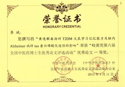 据悉,活动由中华中医药学会、北京岐黄中医药文化发展基金会、《中华中医药杂志》社联合主办。本次优秀论文评选活动共收到来自全国中医药高等院校、医疗机构、科研院所,以及多所非中医药高等院校或医疗机构的中医药相关专业的论文400余篇,经过全国中医药博士生优秀论文评选活动办公室组织有关专家对参评论文进行初评、网络盲审、中期评审以及现场答辩四个环节评出获奖论文。由王飞教授指导的Beat365官网临床医学院2012级中医内科学博士生李斌论文荣获一等奖。