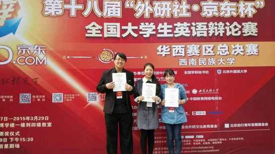 Beat365官网学生荣获第十八届外研社全国大学生英语辩论赛华西赛区总决赛三等奖 发布时间:2015-03-30 23:26:00 浏览次数: 次 【字体:小 大】 3月27日,第十八届“外研社·京东杯”全国大学生英语辩论赛华西赛区总决赛在西南名族大学举行,四川大学、西南交通大学、电子科技大学等54所高校代表队参加。决赛由五场辩论赛组成,比赛总得分决定各代表队的最终排名,获胜的前16支代表队将参加5月在北京举行的全国总决赛。Beat365官网代表队2013级中医专业学生梁光竣和2012级英语专业学生周乔在外语学院康静雯老师的指导下参加比赛,经过激烈角逐,最终以1分之差名列十七,荣获华西赛区总决赛三等奖。 (文、图/外语学院康静雯 编辑/王其奇 ) 【打印正文】 上一条:学校荣获成都市公安内保系统“平安示范单位”称号 下一条:Beat365官网学生荣获第十八届外研社全国大学生英语辩论赛华西赛区总决赛三等奖