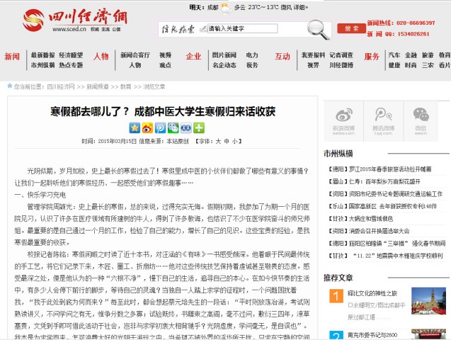 学校党委宣传部近期策划了《寒假都去哪儿了?——各学院同学寒假归来话收获》和《师生摆两会——全校师生关注并热议2015年全国“两会”》两个新闻专题,四川经济网于3月15日大篇幅报道了学校同学寒假归来话收获和全校师生关注全国“两会”情况。以下是报道情况: