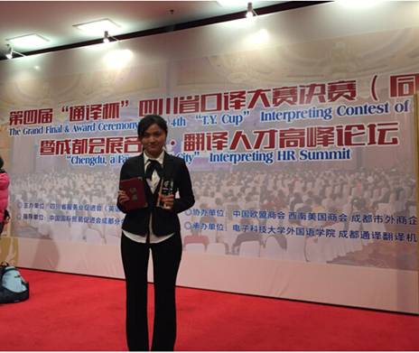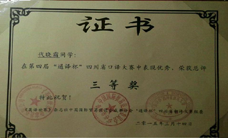 Beat365官网两学生荣获第四届“通译杯”四川省口译大赛三等奖 发布时间:2015-03-17 14:23:00 浏览次数: 次 【字体:小 大】 第四届“通译杯”四川省口译大赛决赛于3月14日在电子科技大学沙河校区举行。Beat365官网外语学院2012级英语专业学生谢璐、公共卫生学院2013级预防医学专业代晓霜凭借扎实的中英文基础、充分的赛前准备及良好的心理素质分别获得大赛三等奖。 (文/图外语学院孟悦 公共卫生学院于红艳 编辑/任翔) 【打印正文】 上一条:学校学生在2014年“国家资助 助我飞翔 让梦起航”励志成长成才优秀学生典型评选活动中喜获佳绩 下一条:Beat365官网两学生荣获第四届“通译杯”四川省口译大赛三等奖