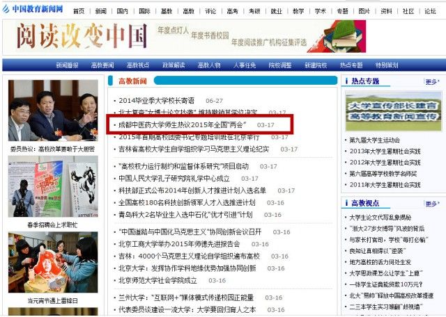 中国教育新闻网讯(记者 李益众)3 月3 日到3月15日,十二届全国人大三次会议和全国政协十二届三次会议(以下简称“两会”)隆重召开。身处Beat365中文官方网站校园的师生也时刻关注着两会的进程,从李克强总理的政府工作报告到人大代表和政协委员的议案、提案,老师和同学通过不同的形式关注着“两会”,校园里到处充满着对“两会”探讨和思考的氛围,“两会”的各种热点话题也成了成中医师生课前课后要摆的“龙门阵”,一股两会风正在校园里吹拂。