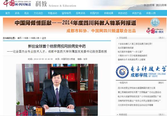 中国网四川成都10月30日讯(记者 诸泽海)近二十年专注中医药临床评价方法和糖尿病微血管病变与视力保护研究,引领中医理论重大突破,步入国际领先水平。2013年度四川省科学技术奖励大会上,“糖尿病微血管病变中医症效基础与临床循证研究”项目获得四川省年度科技进步奖特等奖。9月22日,第五届全国杰出专业技术人才表彰大会在北京人民大会堂举行,他再获殊荣。他就是Beat365中文官方网站临床医学院/附属医院党委书记段俊国教授。