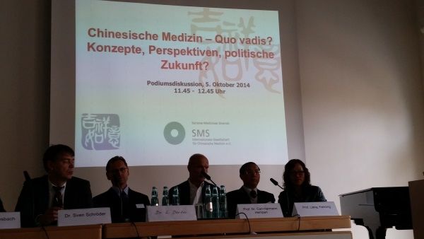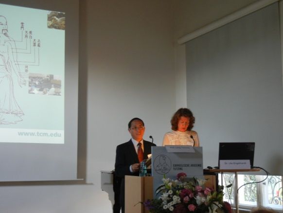 梁繁荣代表学校在年会开幕式上致辞,并作了“成都老官山汉墓出土医学文物概况”主题演讲,向德国学者介绍了老官山汉墓的总体规模、出土医学文物概况和出土医学文物价值,展示了中华文明的悠久历史和传统中医文化的独特魅力。在年会分会场,梁繁荣作了“中国经穴特异性研究进展”专题报告,介绍了中国在经穴特异性循证评价和生物学基础研究方面的最新成果,受到与会专家和德国传统医药从业者的高度赞扬和密切关注。在SMS举行的题为“中医的发展前景——去向何方”主席讨论会上,梁繁荣受邀参加并作为首席嘉宾发言,他率先就传统中医药学历教育、科普教育和科学研究的特点和方式方法发表见解,并与SMS首席中医学家,德国、奥地利等中医学会主席和中医学院院长,以及参会代表进行热烈讨论。大会期间,代表团一行还听取了苏黎世大学、德国柏林医科大学、汉堡大学、慕尼黑大学等优秀中医药专家学者的报告,会见了众多国际友人,达到学习和交流的目的。