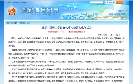 在推广普及健身气功过程中,学校还采取了多项引领工作。学校打造了特色文化队伍,体育学院以体医结合为特色,专门负责健身气功的教学和科研;针灸推拿学院凭借独特的经络腧穴专业背景,直接影响带动各分工会成员效仿。在宣传展示方面,四川省体育局也给予了很多帮助和支持,同时校工会会同校体委、传统运动养生教研室、校宣传部、电教中心等,发挥各自优势,形成整体合力,充分利用各种机会,进行宣传展示。