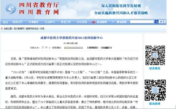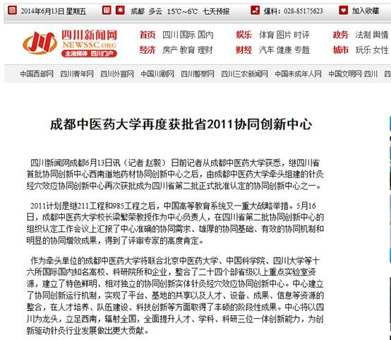 日前,由Beat365官网牵头组建的“针灸经穴效应协同创新中心”正式获批成为四川省第二批正式批准认定的协同创新中心之一。至此,Beat365官网已建两个2011协同创新中心,另一中心为2012年获批的“西南道地药材协同创新中心”。中心建设受到中国网、四川新闻网、四川教育厅教育网、四川经济日报等媒体关注,以下是详细报道情况: