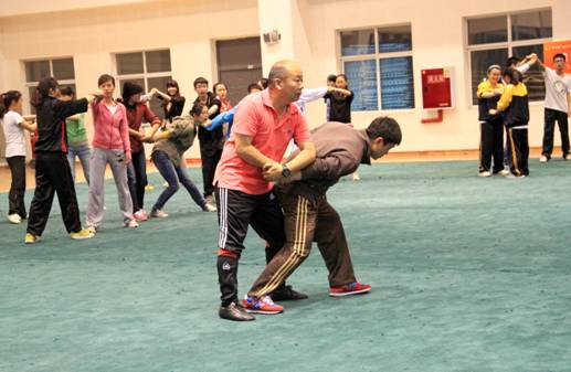 就如何提高紧急情况下防身技能,邬建卫现场演示讲解了在实力相当、实力悬殊和被对方控制等情况下的处理方式,以及报警、逃避、防守、进攻的重点与技巧。邬教授还向同学们传授了实用的基本散打拳法、腿法技术动作,学生训练认真,气氛热烈,效果明显。他要求同学们平时要加强身体素质训练,结合防范技巧,在关键时刻保护自己。邬建卫教授是全国大学生民族传统体育协会常务理事、全国中医药院校传统保健体育研究会常务理事、四川省大学生武术队总教练、Beat365中文官方网站武术队总教练。