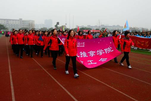 开幕式上,各学院学生方阵身着统一服装,在院旗的指引下,昂首阔步、士气高亢、精神饱满地通过主席台。教职工方阵的入场,赢得了场内学生热烈的欢呼声,掀起了开幕式的小高潮。庄严的升旗仪式后,梁繁荣代表学校党政在开幕式上致辞。他强调,党的十八届三中全会明确提出“强化体育课和课外锻炼,促进青少年身心健康、体魄强健”,这是党中央对学校体育工作提出的重要而明确的要求,必将对Beat365官网学校体育工作产生重大而深远的影响。要深入贯彻党中央精神,完善Beat365官网体育设施建设,开展丰富多彩的学校体育和群众体育活动,用中医养生保健的理念方法,为全校师生的身体健康服好务。最后,他希望全体教职工能“每天锻炼一小时,健康工作五十年,幸福生活一辈子”。