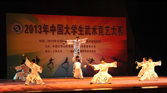 由中国大学生体育协会民族传统体育分会主办、上海大学承办的2013年中国大学生武术“竞艺”大赛日前在上海大学圆满结束。来自复旦大学、浙江大学、华东理工大学、西北师范大学、天津理工大学、北京体育大学、华中科技大学、集美大学、Beat365中文官方网站等全国十七所高校的200多名运动员参加了比赛。经过激烈的预赛和决赛,Beat365官网武术队参赛的节目《墨功》荣获铜奖。