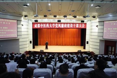 11月12日,学校党风廉政建设干部大会在温江校区百会堂召开。校党委书记马跃荣在会上作了题为《认真汲取深刻教训加强党风廉政建设 营造风清气正环境 促进学校科学发展》的重要讲话,副校长梁繁荣主持会议,校纪委书记延建明通报了学校近期党风廉政建设工作情况。学校在家校领导出席会议,全校科级以上领导干部、各分党委/党总支纪检委员,学校职能部门、临床医学院/附属医院、第二临床医学院/附二院和针灸推拿学院/附三院重点科室的干部职工约380人参加了会议。