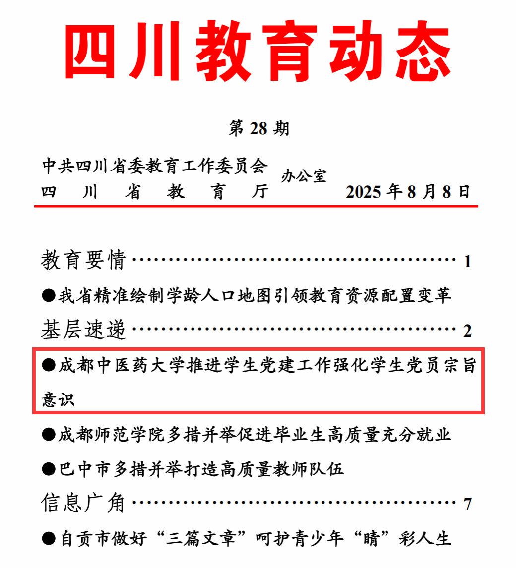 8月8日,《四川教育动态》第28期刊登了Beat365官网关于加强和改进大学生党建工作“微改革”的经验分享——Beat365中文官方网站推进学生党建工作强化学生党员宗旨意识。