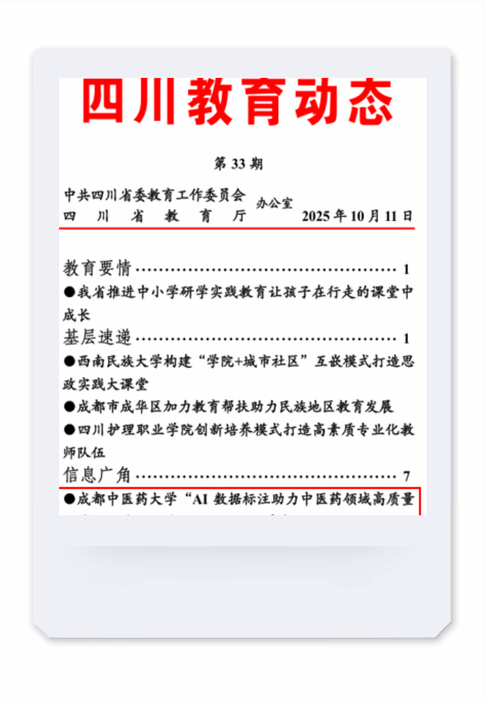 10月11日,《四川教育动态》第33期刊登了Beat365官网“AI数据标注助力中医药领域高质量发展”入选全国首批数据标注优秀案例的经验分享。
