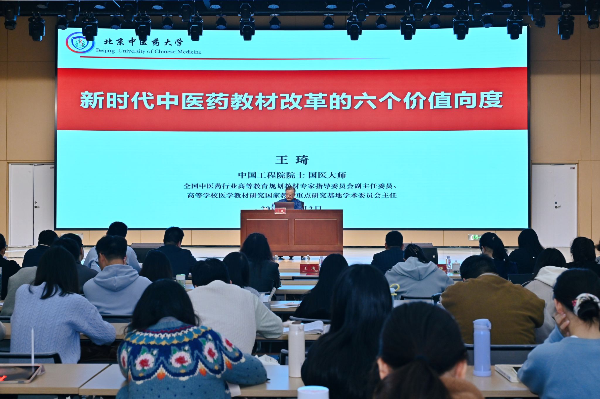 开班仪式后,王琦院士为师生带来两场专题授课。第一堂课的题目是《新时代中医药学教材改革的六个价值向度》,他立足时代需求剖析教育创新路径,强调教材需衔接传统与现代,从价值引领等六维推动改革,通过深耕教材实现传统精髓与当代需求的融合,焕发中医药新生命力。第二堂课的题目是《<中医学导论>第一讲:从零到一的故事》,他聚焦中医起源与核心理论,结合九种体质学说,回溯理论从萌芽到成形的脉络,以“零”解析生命、疾病与健康的原始认知,以“一”串联体质辨识框架构建,还原“观象取类”等思维原点,揭示该原创理论的基础性地位。课堂互动热烈,王琦院士还回应师生提问,深化青年学子对中医本源的理解,激发大家对传统医学未来的探索热情。