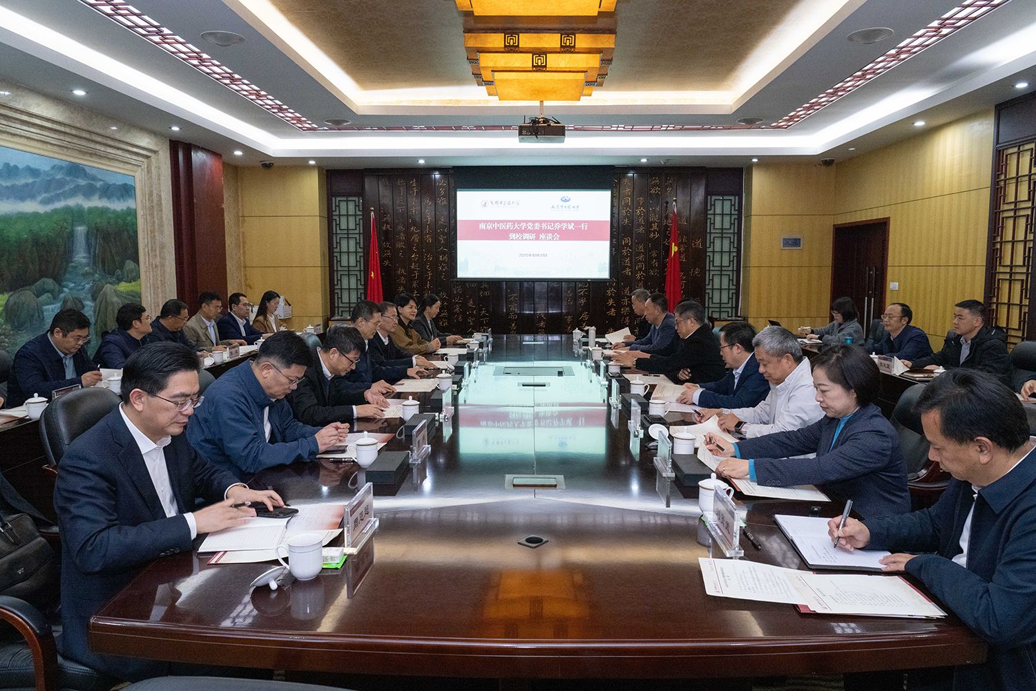 10月31日,南京中医药大学党委书记乔学斌一行到校调研。学校党委书记张泽钧,党委副书记、纪委书记郑学斌,副校长国锦琳出席调研座谈会。