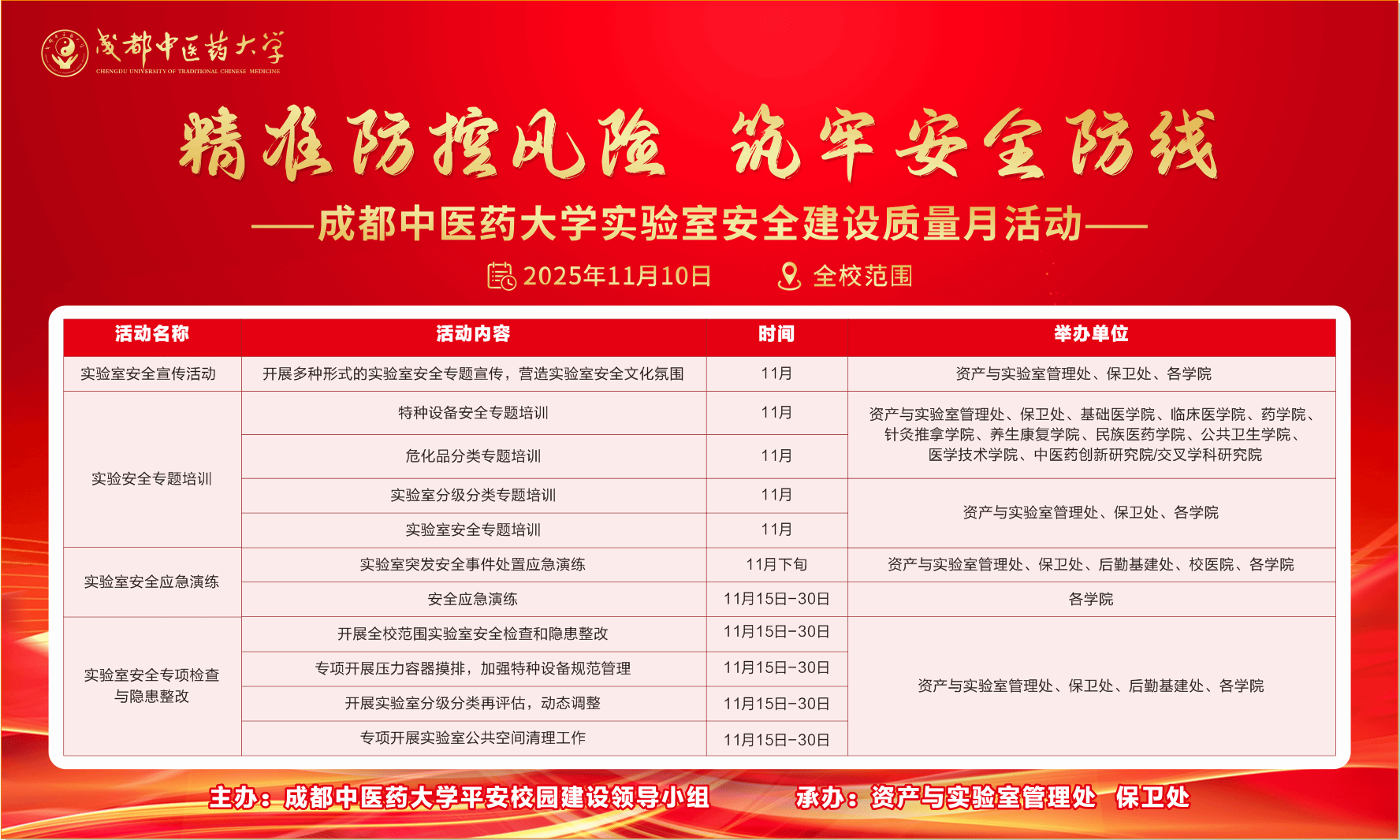为进一步强化实验室安全管理,提升师生安全素养,构建平安校园,刚刚过去的11月,学校紧紧围绕“精准防控风险,筑牢安全防线”主题,成功开展了实验室安全建设质量月系列活动。活动包括实验室安全宣传、实验安全专题培训、实验室安全应急演练、实验室安全达人知识竞赛等多维度举措,在全校范围内掀起了一股“学安全、讲安全、保安全”的热潮,有力夯实了实验室安全根基,为学校教学科研事业的高质量发展提供了坚实保障。
