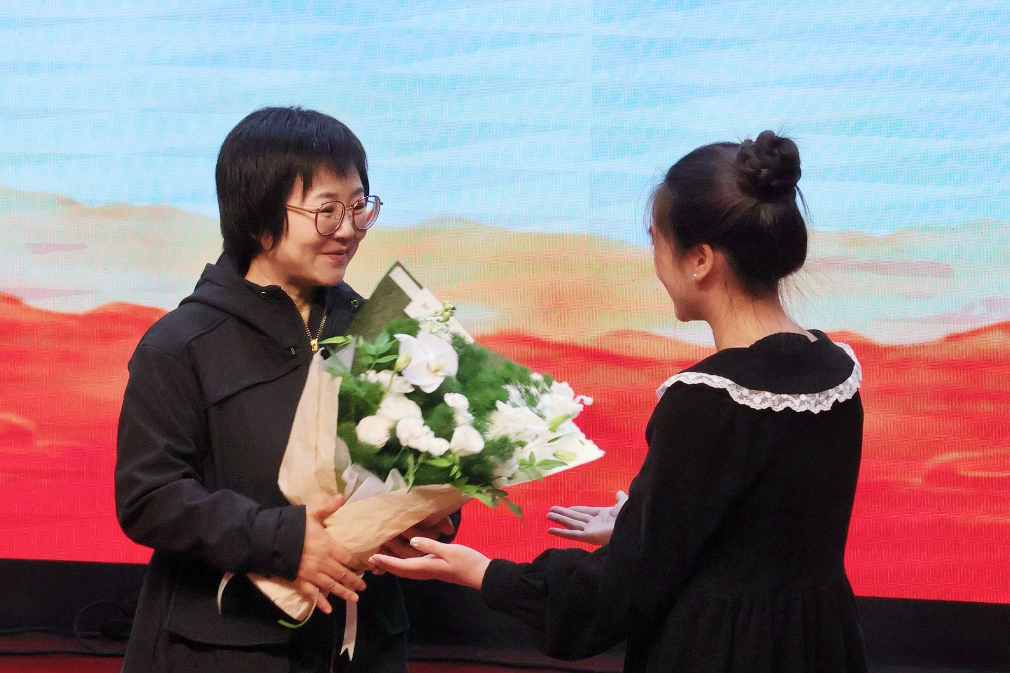 报告结束后,学生代表向朱容瑢女士敬献鲜花。正如朱容瑢女士所嘱托的那样,成中医学子将接过这支红色接力棒,坚守医德、精进医术,立誓守卫好人民群众的生命安全。
