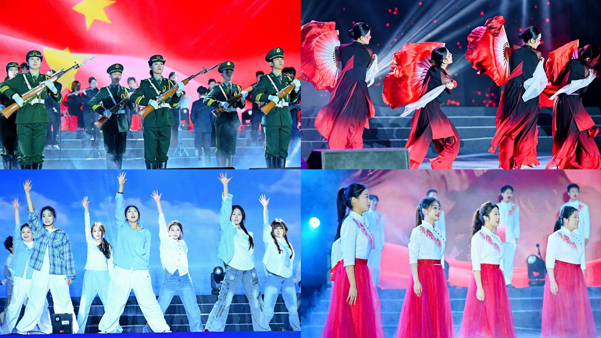 第三篇章“筑梦华章”聚焦新时代、新征程和新愿景。音乐交响《钢铁洪流进行曲》以激昂的旋律、整齐的队列展现出青年一代的责任担当与昂扬斗志,赢得现场阵阵掌声;歌伴舞《天生就要飞》传递出青年学子追逐梦想、勇往直前的精神风貌;中国舞《溯•跃》以精湛的编排诠释了传承与创新的时代力量;合唱《爱永在》用温暖嘹亮的歌声传递团结奋进的正能量,引发全场情感共鸣。