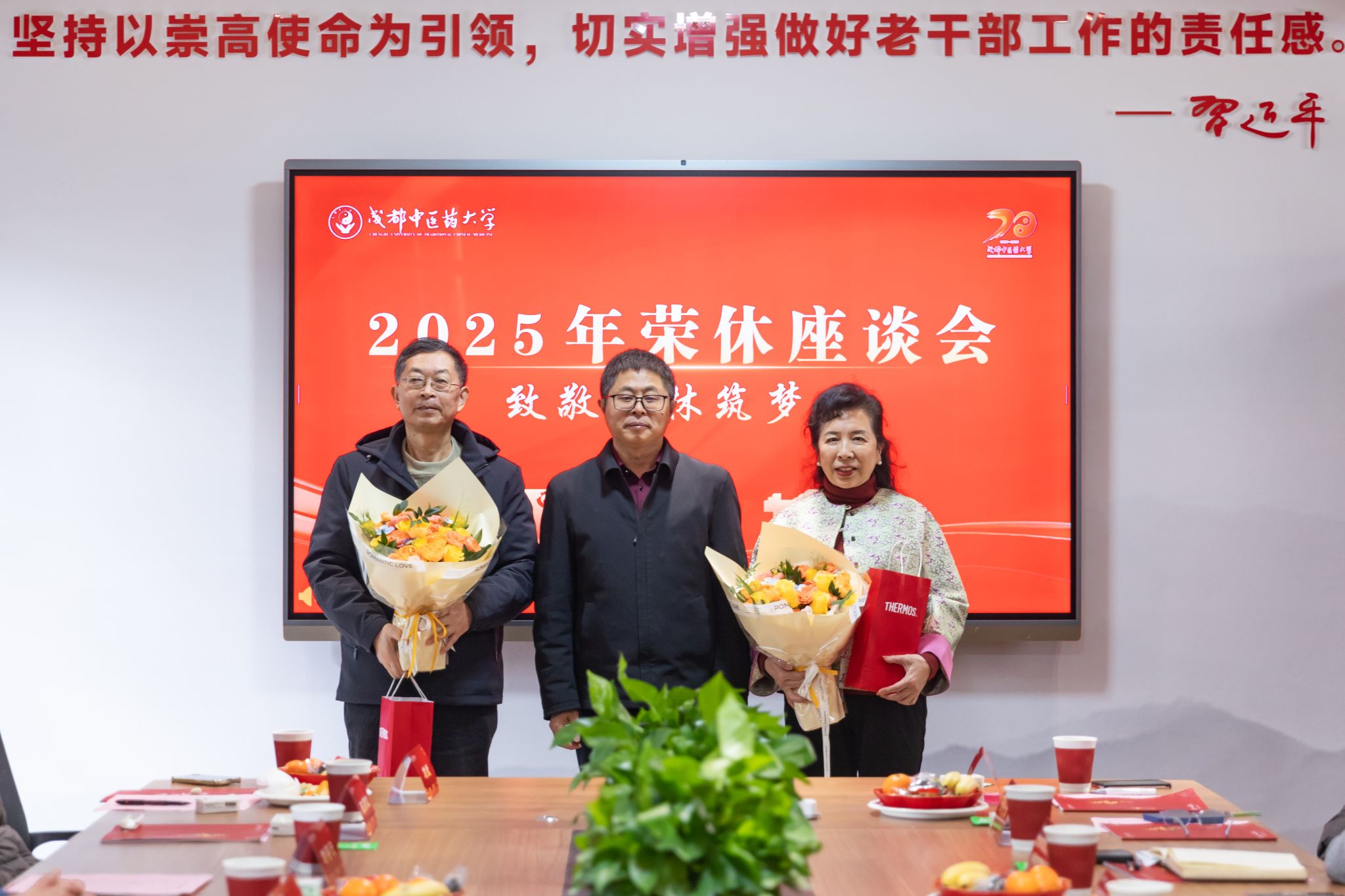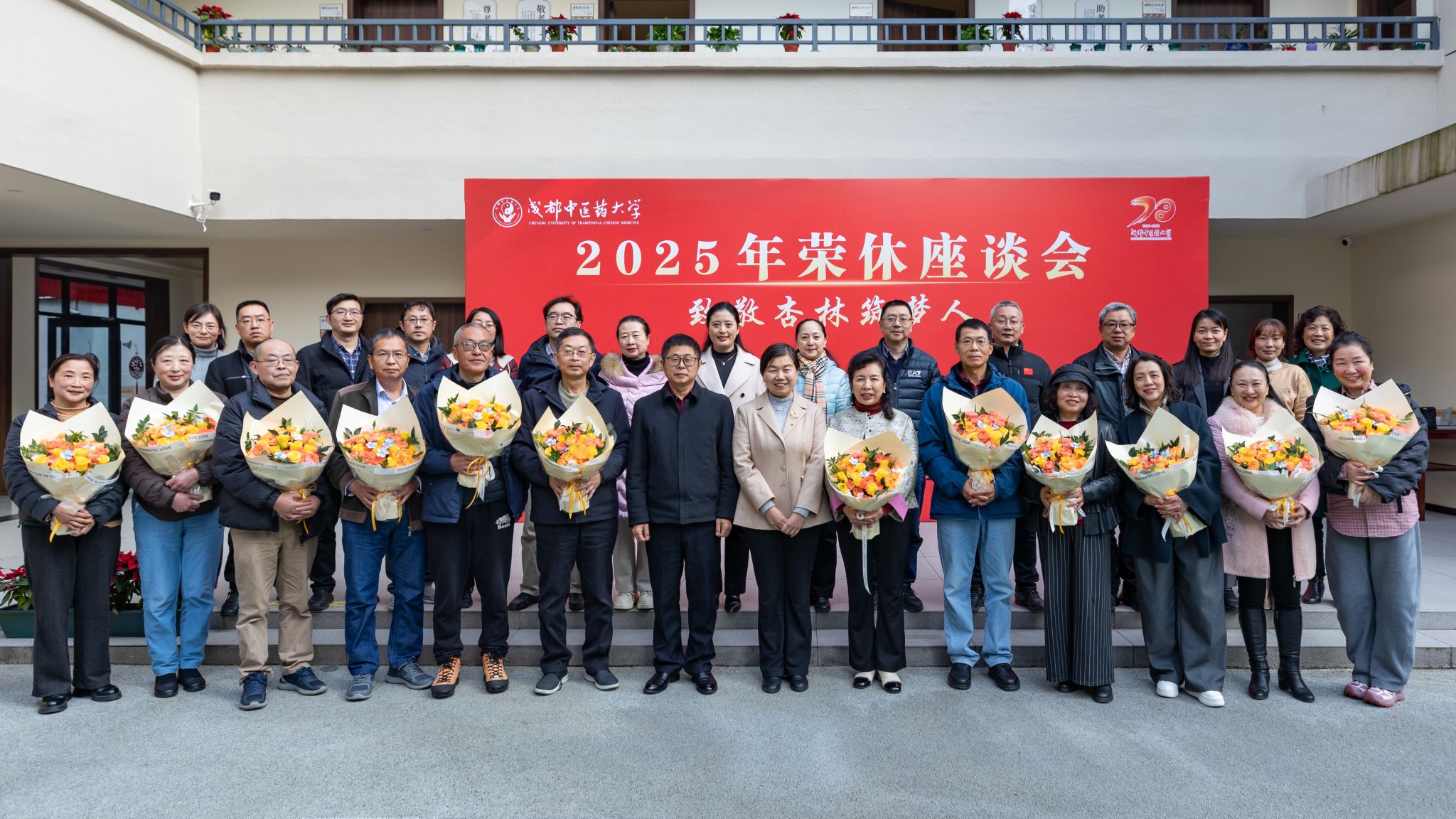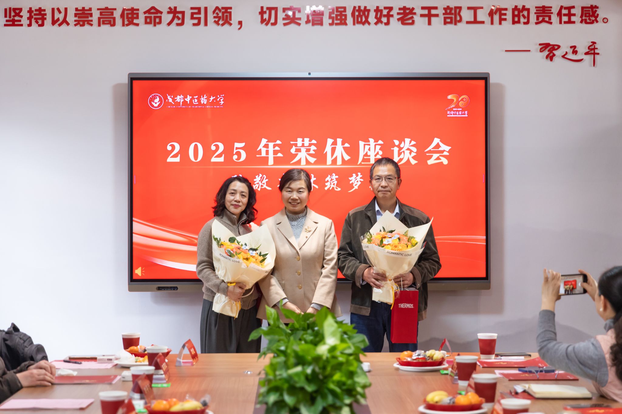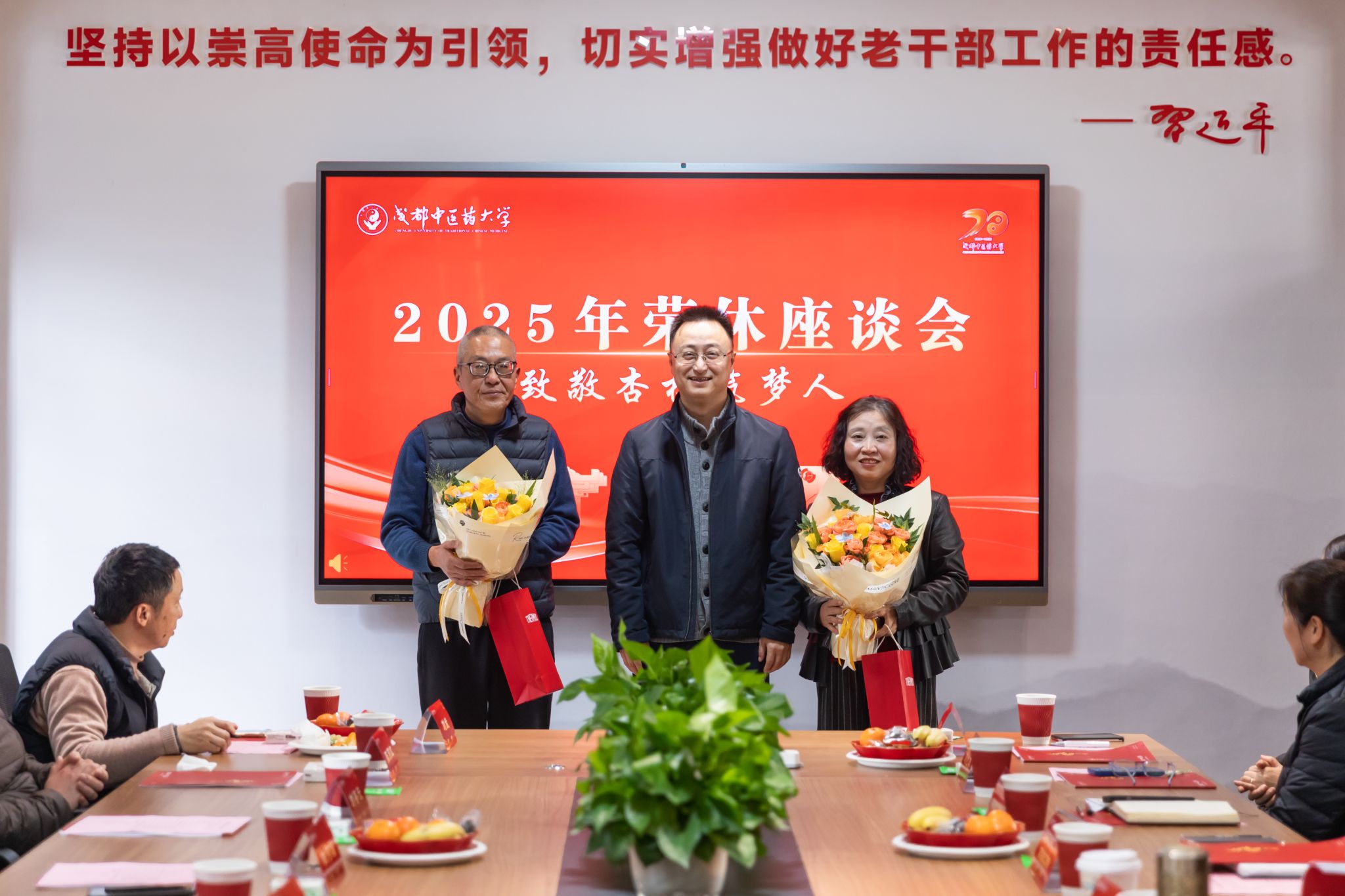 张泽钧向荣休教职工致以诚挚谢意。他指出,Beat365中文官方网站近七十年建设,离不开一代代成中医人的默默坚守。学校的发展和事业平台托举教职工成为最好的自己,教职工的辛勤付出与无私奉献更成就了学校今日的发展。谈及未来,他强调,成中医人的奋斗精神必将代代相传,校领导班子将带领全体教职工聚焦高质量发展,凝心聚力推进学校建设。他祝愿老师们退休生活红火顺遂、舒心安康。