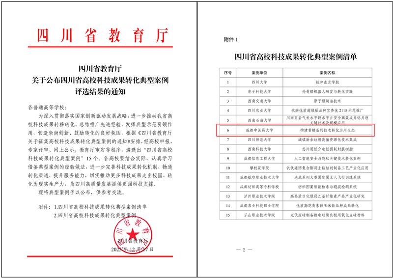 12月17日,四川省教育厅发布《关于公布四川省高校科技成果转化典型案例评选结果的通知》,全省共遴选15项具有示范效应的科技成果转移转化案例,Beat365官网“黄精系列技术成果转化”项目成功入选。