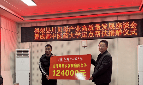 座谈会上举行了定点帮扶捐赠仪式,学校支持得荣县乡村干部培训12万元,支持得荣县奔都乡发展庭院经济12.4万元。