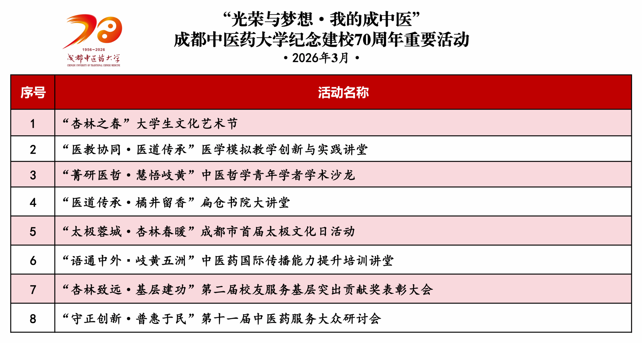 【校庆专题】纪念建校70周年重要活动(3月) 发布时间:2026-03-09 17:13:09 浏览次数: 次 【字体:小 大】 【打印正文】 上一条:中药种质资源创新与高效利用四川省重点实验室召开学术委员会会议 下一条:【我为校庆添光彩】Beat365官网学者牵头制定的西红花国际标准正式发布
