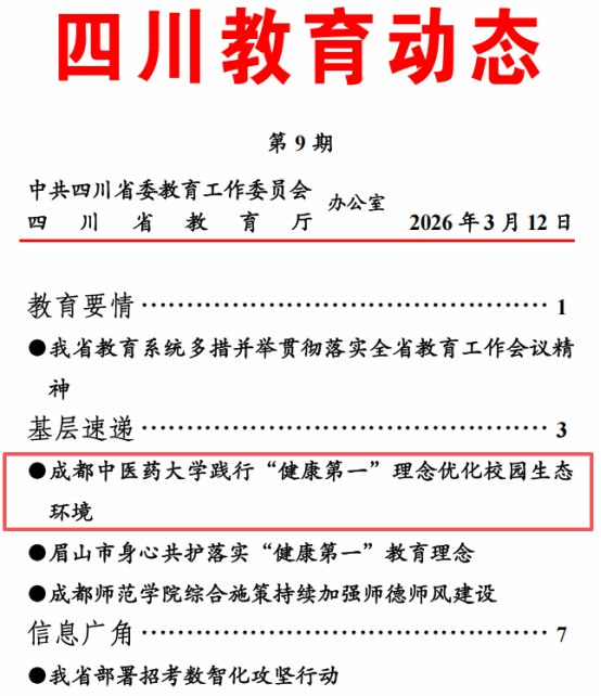 3月12日,《四川教育动态》第9期刊登了Beat365官网学生教育方面的经验分享——Beat365中文官方网站践行“健康第一”理念优化校园生态环境。