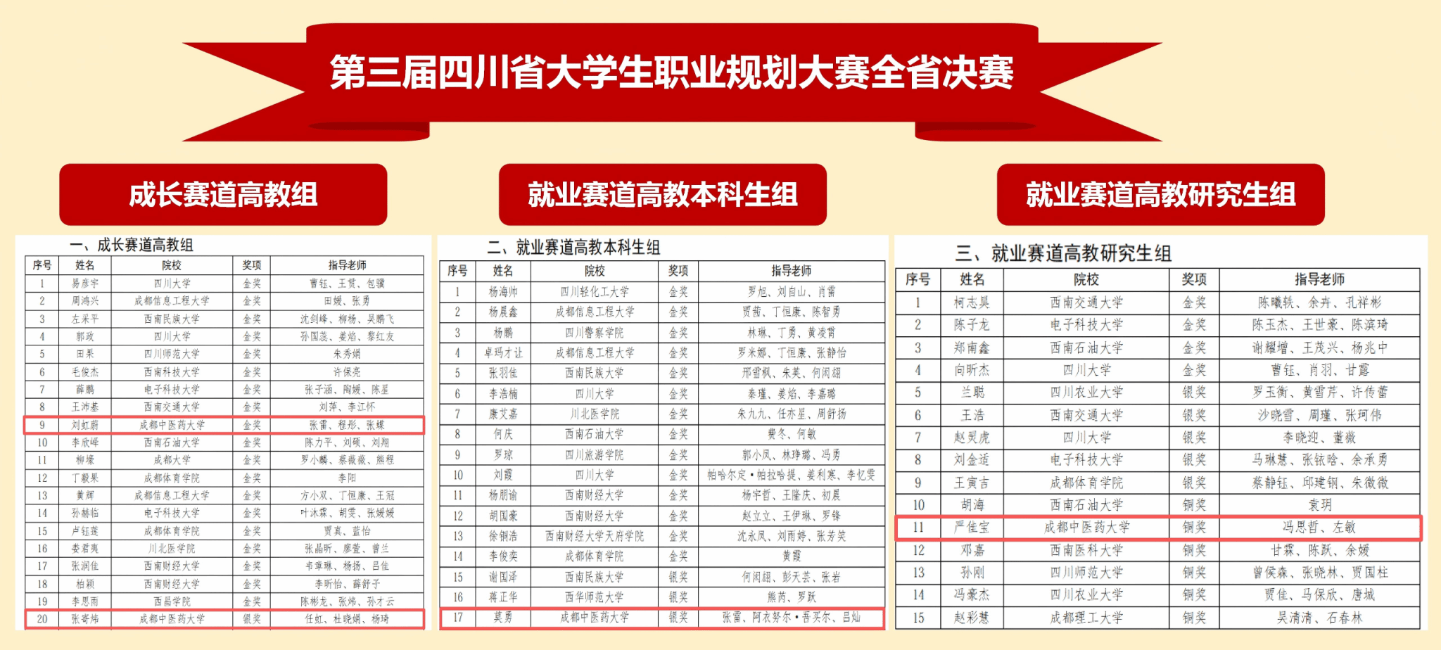 3月13日至15日,第三届四川省大学生职业规划大赛决赛在成都举行,Beat365官网晋级决赛的4名学生发挥优异,最终取得1金2银1铜的好成绩。