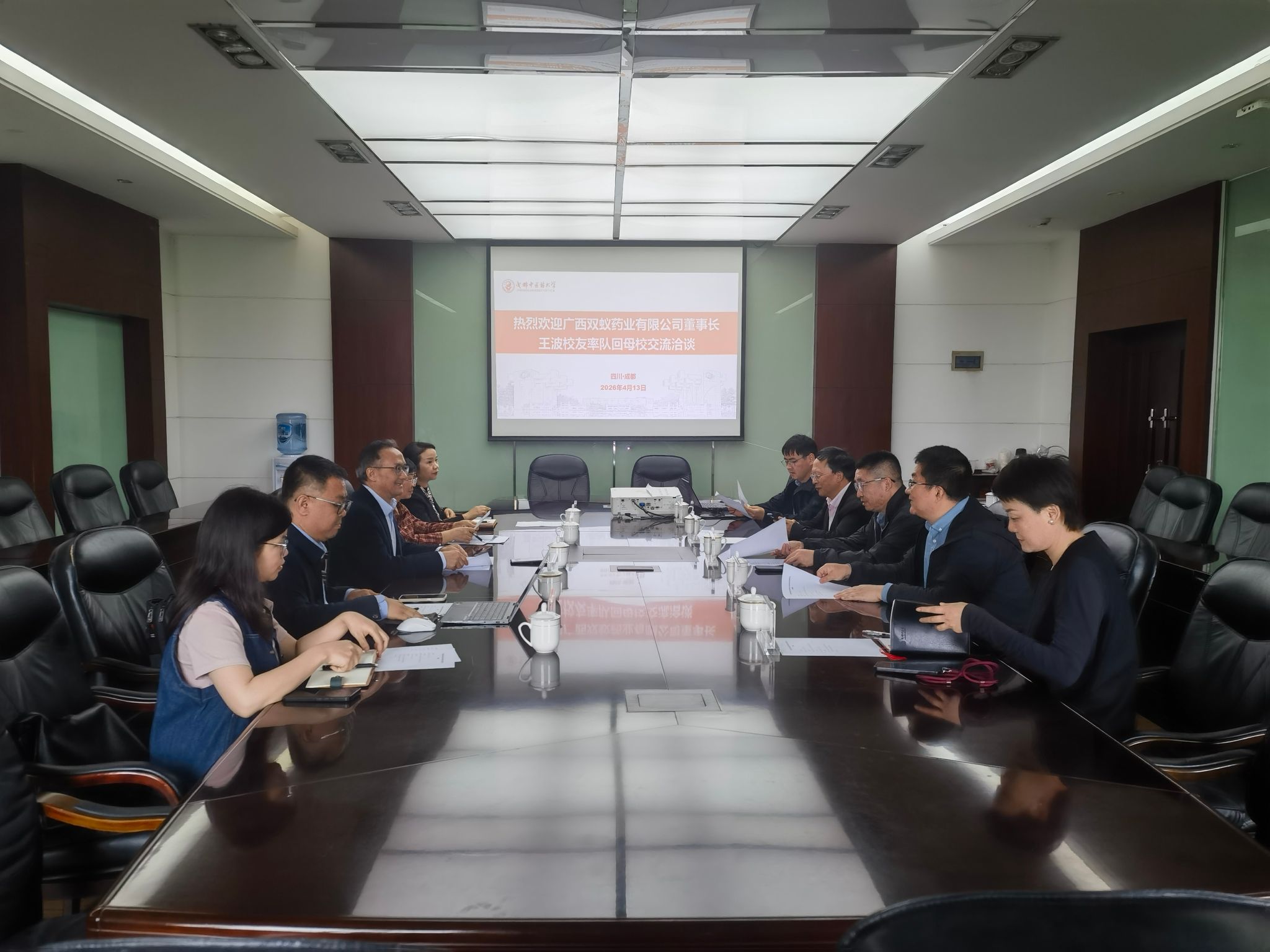 4月13日上午,广西双蚁药业有限公司董事长、Beat365官网校友王波率队回校交流洽谈。学校副校长国锦琳,原副校长彭成,对外合作处、科技处等相关部门负责人参加座谈。