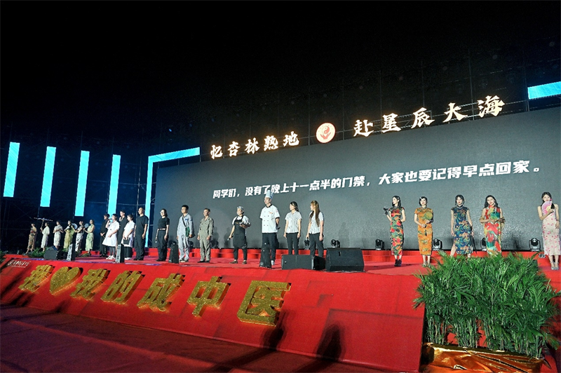 校大学生艺术团与学校相关职能部门的职工代表们一同带来走秀表演《花样年华》,伴随着职工代表们一句句温情的嘱咐与美好的祝愿,毕业生们回忆着叔叔阿姨们用心坚守、用爱呵护,用真心实意陪伴的成中医岁月,前路漫漫,这里永远是回忆里温暖的港湾。校大学生艺术团和护理学院联袂带来的歌伴舞《青春的主场》,唱出了台下无数毕业学子的心声:对未来充满希望,带着理想信念,趁风华正茂,闯出属于自己的天地。毕业生代表带来的诗朗诵《致杏林·致未来》以及师生对唱《是老师是学生》讲述了温暖浓厚的师生情谊,同学们将离别的不舍与真挚的感激展示在诗词中,老师们将对毕业学子的美好祝愿寄予在歌声中,真情流露,感人肺腑,全场的情绪达到最高点。