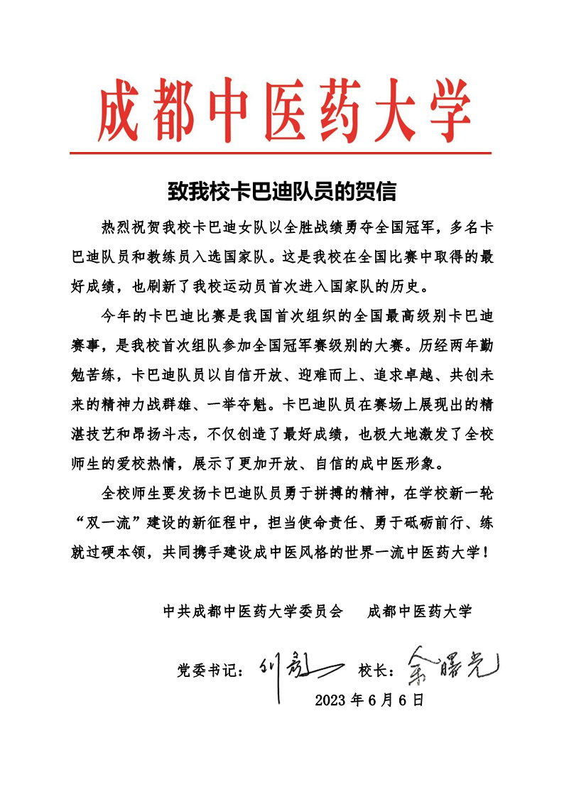 致Beat365官网卡巴迪队员的贺信 发布时间:2023-06-06 16:15:12 浏览次数: 次 【字体:小 大】 【打印正文】 上一条:刘毅率团访问英国基尔大学及英国兰中医学院 下一条:【调研进行时】高质量学校实验平台建设及大型仪器平台共享调研:副校长黎胜红赴学院开展调研