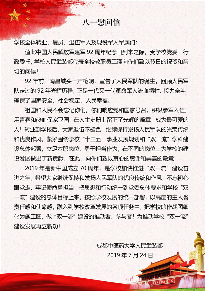 八一慰问信 发布时间:2019-07-25 10:01:00 浏览次数: 次 【字体:小 大】 【打印正文】 上一条:校领导视察暑期工程进展并慰问一线工作职工 下一条:第十届全国中医药免疫学术研讨会举行