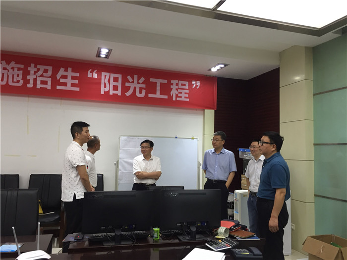 在招录工作现场,校领导一行听取了招生就业处处长叶军关于2019年学校招生计划、录取日程安排等录取工作的汇报,并细致了解了Beat365官网当前在各省市的录取进程、录取的生源质量、生源构成、各专业分数线等情况。