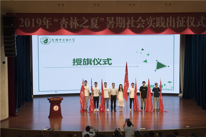 沈涛为实践小队代表授旗并讲话:开展社会实践是贯彻党的教育方针的重要措施,是加强和改进高校思想政治教育的重要途径,是大学生奉献社会、报效国家的有效载体,对同学们认识社会、了解国情民情,增长才干、增进与人民群众的感情、增强社会责任感具有不可替代的作用。今年学校以“青春心向党,建功新时代”为主题开展暑期社会实践活动,希望同学们在实践中发扬成中医人精神,在实践中学习、磨练、成长。他希望各实践小队一是要确保安全。带队老师和同学们一定要树立“安全第一”的意识,始终把安全工作放在首位;二是要勤学善思。把社会当作大课堂,虚心向群众学习,脚踏实地,勤于观察;三是要发挥优势。充分发挥Beat365官网大学生的自身专业优势,结合地方需求,进一步增强社会实践的针对性和实效性,提升大学生社会实践的整体水平;四是要扎实服务。希望同学们不怕苦,不畏难,坚持知识与实践相结合,把自己所学到的专业知识转化服务人民、服务社会的实践能力,以优异的成绩向新中国成立70周年献礼。