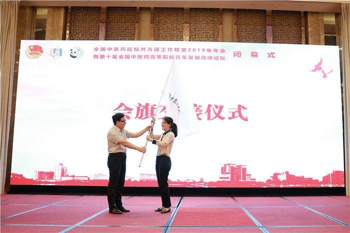 全国中医药院校共青团工作联盟2019年年会暨第十届全国中医药高等院校青年发展高峰论坛圆满完成各项议程后举行了闭幕式。会议对第七届“远志杯”全国高等中医药院校大学生课外学术科技获奖作品、年会“优秀论文”获奖作品进行了表彰。联盟理事长单位领导共同按下水晶球,启动将于今年7月在Beat365中文官方网站举行的“青马工程·岐黄精英”首期培训班。温江区委常委、总工会主席刘宇彤为来自上海中医药大学的学生代表授予“感知温江行”旗帜,欢迎广大青年学子前来了解温江、体验温江、扎根温江。