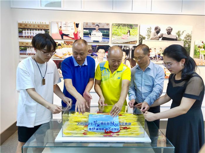 6月19日下午3时,国学院院长、博物馆馆长邬建卫带队博物馆职工将2019年毕业传穗礼所用金穗与2019届毕业生花名册搬运并正式典藏于Beat365官网校史馆。