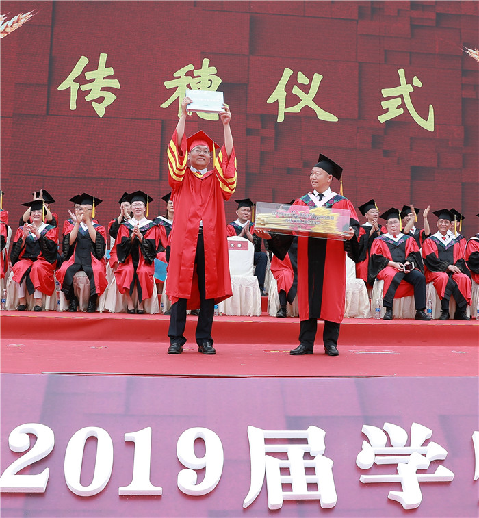 传穗承厚德,拨苏正学实,传穗礼是本届毕业典礼的亮点之一。以传穗承厚德,象征毕业生从青葱幼苗茁壮成长成熟为饱满的麦穗,他们铭记厚德博学、精思笃行的校训,成为德才兼备,学思并重的新时代优秀青年。典礼上,由学校学位评定委员会主席、校长余曙光将象征着耕耘与收获的麦穗递予学校学位评定委员会委员,委员们再将金灿灿的麦穗分别传递给各学院师生,进行全场传递。传穗仪式就是传承仁爱厚德、笃行励志,就是传承成中医人的宝贵品质。传穗礼毕,余曙光将金穗与2019届毕业生花名册正式交予博物馆馆长、校史馆负责人邬建卫。