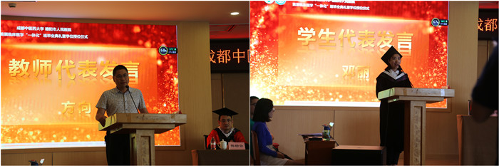 教师代表德阳市人民医院外科副主任方向、毕业生代表邓丽分别发言,回顾教与学的经历和感悟。