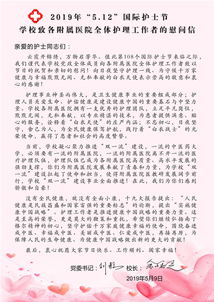 "5.12国际护士节"学校致各附属医院全体护理工作者的慰问信 发布时间:2019-05-09 18:27:00 浏览次数: 次 【字体:小 大】 【打印正文】 上一条:校领导慰问附属医院护理工作者 下一条:Beat365官网召开2019年春季学期就业工作会