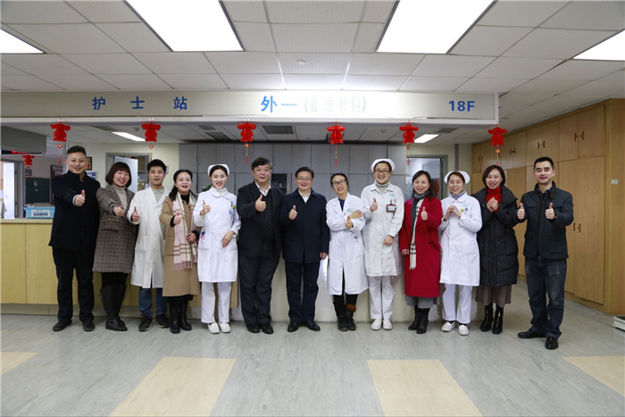 校领导与坚守临床岗位的一线医护人员亲切交谈,详细询问医院春节期间的工作情况,听取了科室的工作汇报,对春节期间值班人员辛勤工作、坚守岗位的奉献精神致以敬意,并代表学校党政送去新春的美好祝愿。
